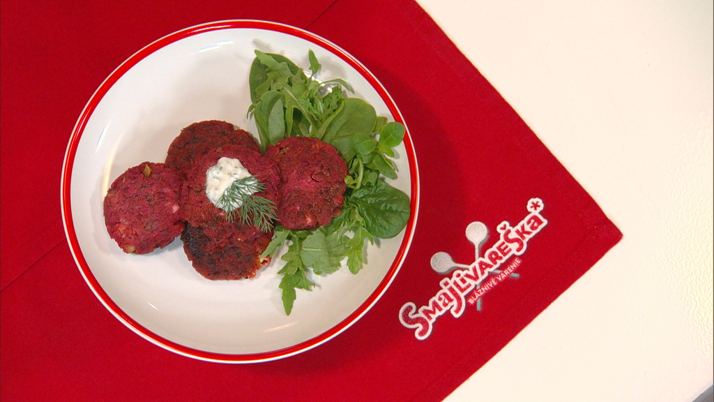 Na SMAJLIPLACKY potrebujeme: 200 gramov uvarenej červenej repy a syru feta, 3 jarné cibuľky, 2 lyžice nasekaného kôpru a mäty, 2 vajíčka, 100 gramov strúhanky, soľ, čierne korenie a olivový olej na opekanie.